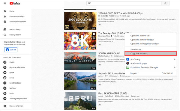 Step 2. Go to YouTube, search for the 8K video you’d like to download, and then right-click to copy its link address to the clipboard.