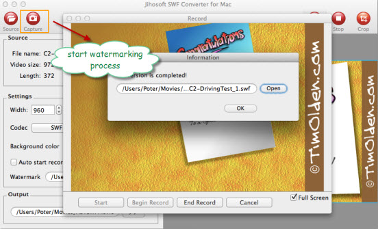 Hit the “Capture” button to open the flash recording window, hit “Start”->”Begin Record” to start the image watermarking process, and click “End Record” will finish the process. When the conversion is done, you will get a flash SWF video with your favorite image watermark.