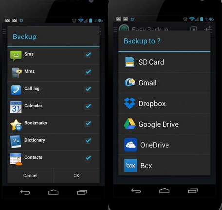 This app permits you to backup app, SMS, MMS, call history, Calender, bookmarks, dictionary and contacts from Samsung, Huawei, HTC, Sony, LG, Motorola, Oneplus, ZTE, etc. In the mean time, the procedure is not complicated at all. First, click backup at the interface, select the file type you need to backup, then, choose SD card, Gmail, Dropbox, Google Drive or Box to keep backup files.