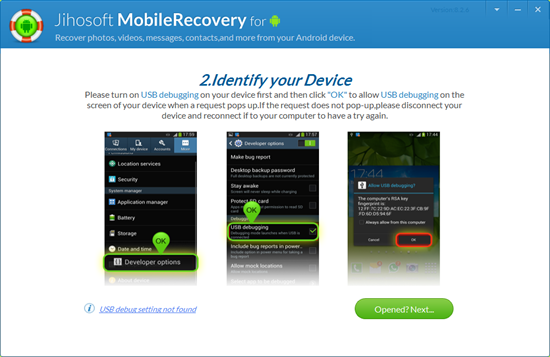 follow this guide. After that, note if a pop-up message appears on your Android screen that hints you to allow USB debugging, click “OK” to authorize. If you have already enabled USB debugging on the Android before, click “Opened? Next...”.