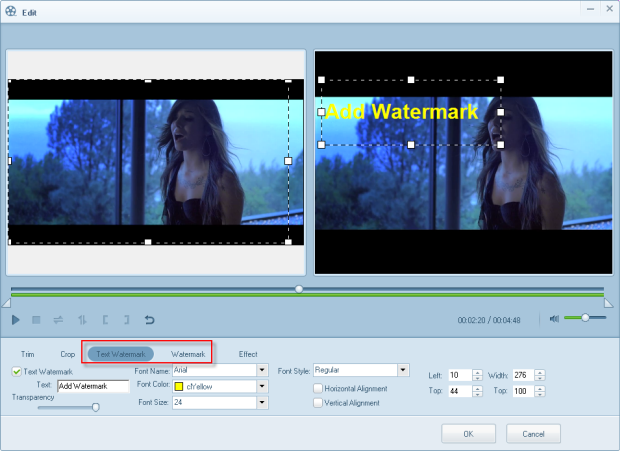 - Add text watermark: After you input the text you’d like to add, you can adjust the transparency, color, font size, font name, font style and position of it.