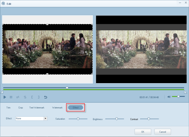 Click the “Effect” button. You can apply effect to the imported video. Also, you can adjust the video’s saturation, brightness and contrast.