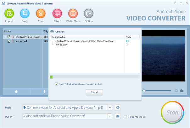 Click the “Start” button to begin the conversion. When the conversion is finished, this Android Video Converter will show you the output folder where the converted video is in. Now transfer the file to your Android device, and you will be able to play the video on Android.