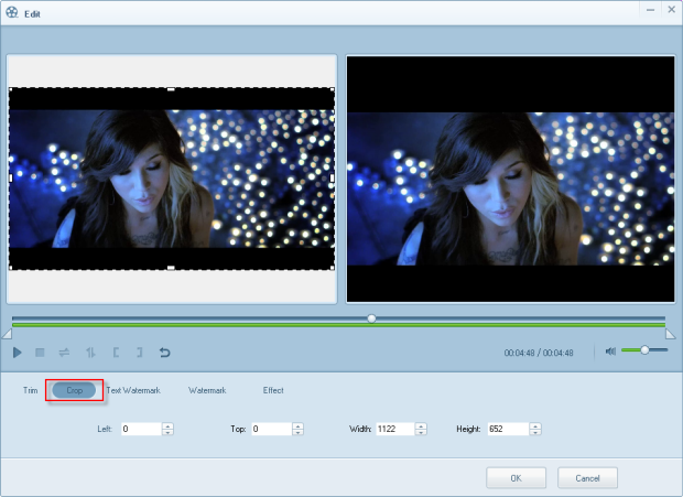 Click the “Crop” button, then you would be able to crop the imported video directly by dragging the playing area, or setting a parameter for the Left, Top, Width, and Height.