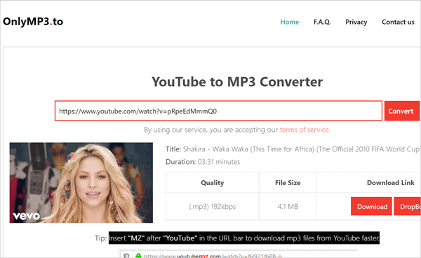 OnlyMP3 can help you convert YouTube videos to MP3 music files with one click! With this free online YouTube to MP3 Converter, you don’t need to Signup or install any software on your device, all you need to do is copy and paste the video URL into the online video converter, it will automatically convert YouTube videos to mp3/audio files, you can also click the Dropbox button to save the file to the cloud platform.