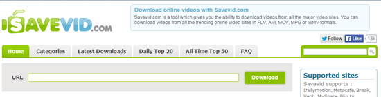SaveVid – SaveVid is an online downloader which gives you the ability to download videos from all the major video sites. You can download videos from all the trending online videos sites in FLV, AVI, MOV, MPG or WMV formats.