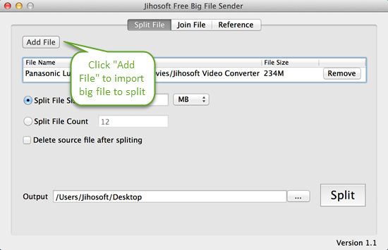 1.Download and install Free Big File Sender on your computer, then run it. In “Split File” tap, click the “Add File” button to import the big file you want to split.