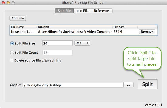 Jihosoft Free Big File Sender provides simple solution to help you split big files into small pieces which are easy to be sent and shared. Also, the freeware allows you to rejoin the split parts together to restore the original file.