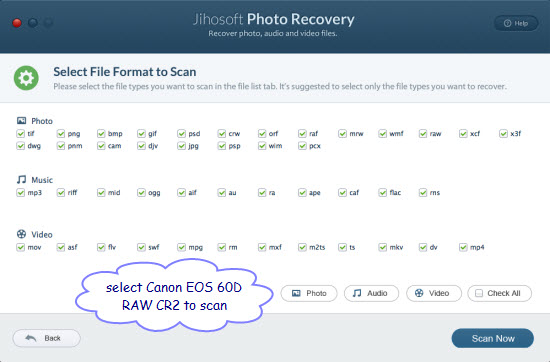 Jihosoft Photo Recovery for Mac is one of the simple to use Photo Recovery application that can get your job done pretty well. It use a simple wizard to take you step by step to recover deleted/formatted JPEG/CR2 from Canon EOS 60D SD/SDHC/SDXC memory card. The included file filter options can be used to filter out the file types you don’t want to scan and image preview tool helps you decide which files you need and which you can simply delete.