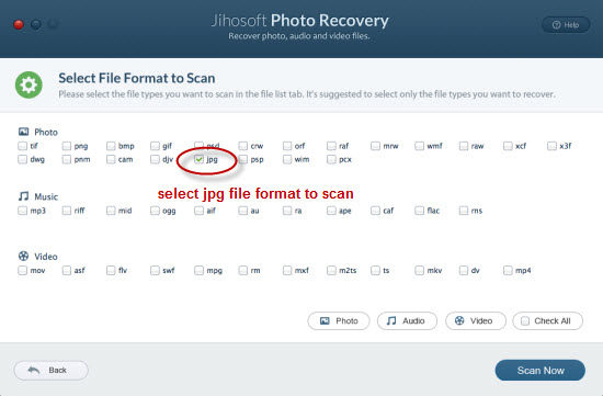 Click “photo” option drop-down list in the opened “Filter Options” window, select “JPG Picture (.jpg)” as the image file format to recover from Canon IXUS cameras. Then click “OK” and right-bottom “Start Scan” button to start photo scanning process.