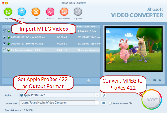 MPEG to ProRes Converter for Mac is an excellent tool to convert MPEG-1, MPEG-2, or MPEG-4 video files to Apple ProRes MOV, so you can import into Final Cut Pro for further editing. Before converting MPEG to ProRes 422, this software allows you do some simple editing, such as, crop MPEG video, trim MPEG file, merge MPEG clips, add watermark, add special effects, etc.