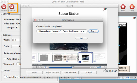 Hit the “Capture” button to open the flash recording window, click “Start”->”Begin Record” to commence the flash conversion, hit “End Record” to stop the conversion. When the conversion is over, a window will open to inform you where the converted file is saved.