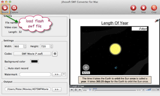 Click the “Source” button to load local swf file to the program, click the “Play” button to preview the flash file in the right displaying window.