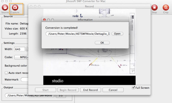 Click the “Capture” button on top-left menu to open the flash recording window. Hit “Start” -> “Begin Record” to set the started frame to capture for conversion, hit “End Record” to set the stopped frame to capture for conversion. When the conversion is over, a window will pop out to inform you to open the converted files in your previously specified folder.