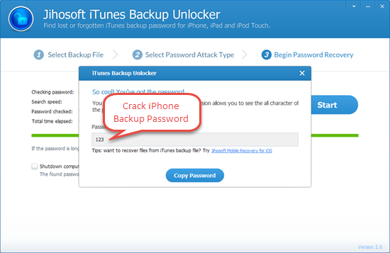 Jihosoft iTunes Backup Unlocker is an excellent tool to crack password protected iPhone backup. The tool enables access to encrypted backups for iPhone 5S, 5C, 5, 4S, 4, 3GS, as well as iPad Air, iPad mini, the new iPad, iPod touch 5/4, etc. Also, it provides three powerful password attack types and supports GPU acceleration with NVIDIA video cards.
