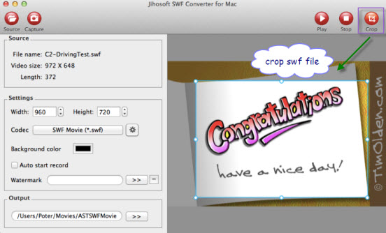 Hit the top-right bottom “Crop” button, then you can crop the flash swf file by dragging the solide line around the frame to crop output wanted parts or black borders.