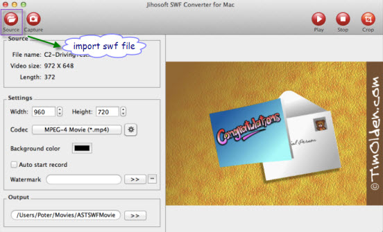 Click the “Source” button on top-left menu to import the swf file you desire to crop from computer local. When imported, click the “Play” button to view the files in the right displaying window.
