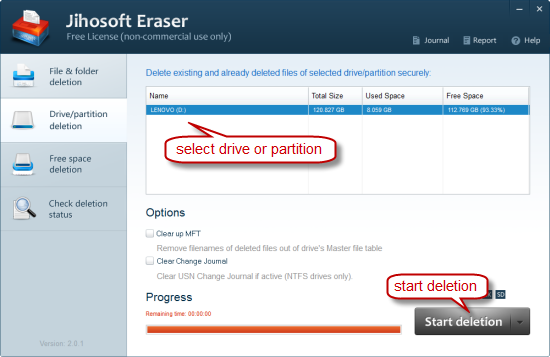 This method is especially useful when you need to erase all the existing and already deleted files of a selected drive or partition. From the detected drive list, select the one that you want to erase. Hit the “Start deletion” button, select a data shredding pattern, and then the deletion begins promptly.