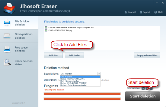 Click the “Add files” or “Add folder” button to import the targeted objects into the eraser. Then from the drop-down list of “Security level”, select one as your desired deletion method. Finally click “Start deletion” to wipe out the data.