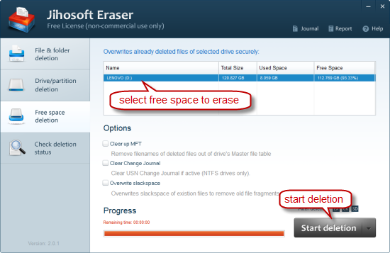 To make the previously deleted files on a specific drive be unrecoverable anymore, you can select this data wipe mode. Choose the drive where its free space you want to erase, click “Start deletion” and pick up a data destruction method, then the free space is being overwritten with random data.