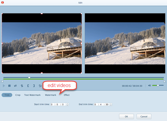 Edit the input files by trimming, cropping, watermarking, or adding effect.
