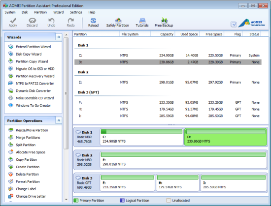 AOMEI Partition Assistant Standard is free disk partition software which offers many powerful features for hard disk and partition management. Users can flexibly manage disk space like resize partition, merge partition, split partition, or copy partition without data loss. This tool supports Windows 8.1, Windows 8, Windows 7, Vista, XP and 2000.