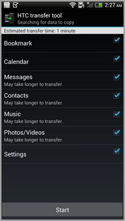 Note: To transfer from iPhone to HTC, you need backup iPhone content to iTunes and use the HTC Sync Manager desktop utility which requires a PC/Mac and cables to make the transfer. Click here for detailed steps.