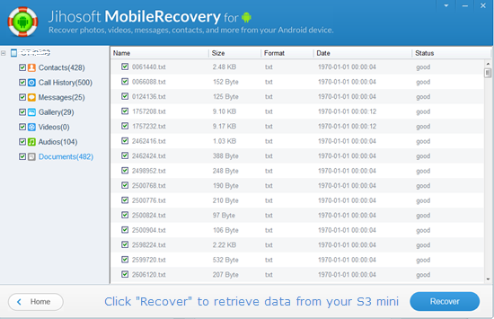 Step 4: Preview and recover data from Samsung S3 mini. In this step, the found photos, contacts, call history, messages, videos, audios, and other documents will be listed by category. Simply select the files you want, and click “Recover” to retrieve data from S3 mini.