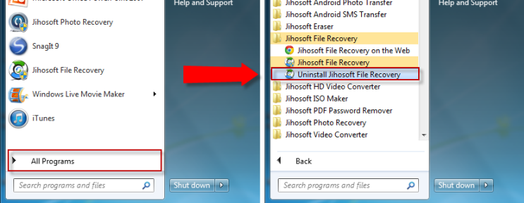 Method 1. From the “Start” menu in the lower left corner of your desktop, select the “All Programs” menu item, then find the Jihosoft program you want to uninstall. From the folder, click on the uninstall option.
