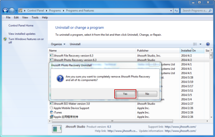 Method 2: Go to “Control Panel” of your PC, then choose “Uninstall a program”. Locate the Jihosoft program you want to uninstall and double-click on it. After that, click “Yes” to uninstall.