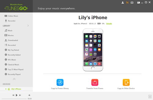 Step 1: Run Wondershare TunesGo, enter the Transfer Music page after your iPhone/iPod/iPad is connected.