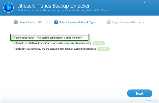 Brute-force Attack will try all possible combination to decrypt iTunes backup, which may take the longest time to find the correct password. Choose this method when you have no clue what the password may be.