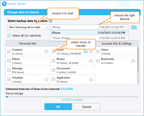 2: When your Galaxy phone is connected, click” Change data to restore”, then choose “Non-Samsung device date”.