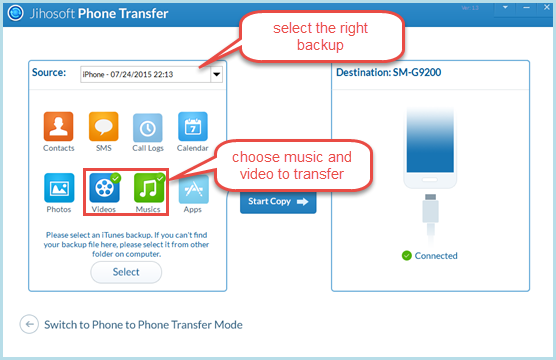 3. Choose the backup you need, and select “Music” and “Videos”. Then click on “Start Copy” to transfer iTunes music, videos to Galaxy phone.