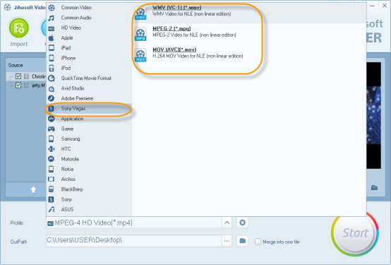 3. Select Sony Vegas preset format as the output profile