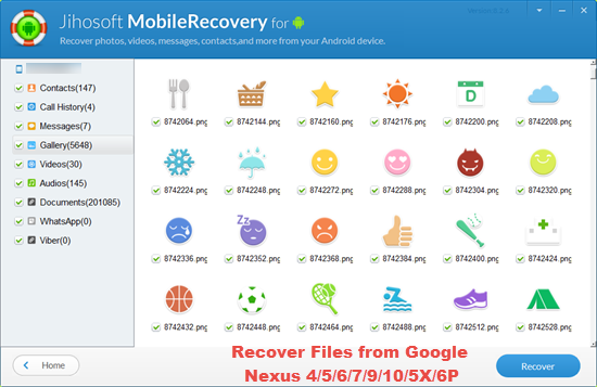A great Nexus data recovery tool we’d like to recommend is Jihosoft Android Data Recovery. It is able to recover deleted files from Google Nexus 4/5/6/7/9/10/5X/6P, etc. With it, you are allowed to recover contacts, text messages, call history, WhatsApp, as well as pictures, videos, audio files from Google nexus’ internal memory & external SD card.