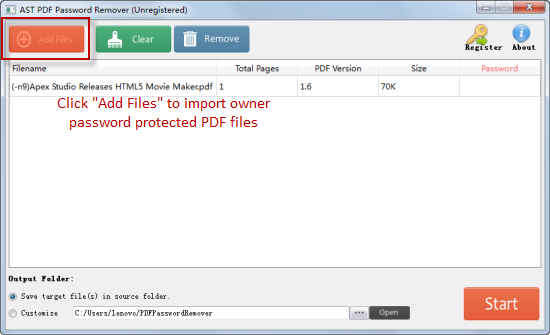 Click the “Add Files” button and browse through your computer to select your owner password protected PDF files. Then click “Open” to add these files to the program for decryption.