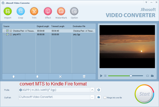 Jihosoft Video Converter for Mac can help you convert MTS files to almost all popular video formats on Mac OS X, featured output profiles like MP4, 3GP, MKV, 3G2, M4V, FLV, AVI, WMV, MOV, WebM, etc. If you need to convert MTS to Kindle Fire supported format on Windows PC, please download Video Converter.