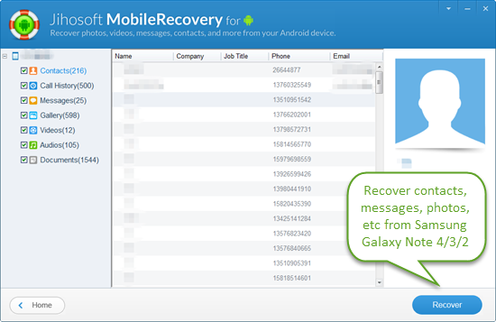 Many Samsung users have the terrible experience of losing important data, while the new Samsung Galaxy Note 4 is no exception. Files stored on your Note 4 can be lost due to accidental deletion, memory card formatting, rooting, factory settings restore, software crash, virus attack, etc. Don’t worry. The good news is that you can recover deleted files from Galaxy Note 4 using Jihosoft Android Data Recovery. The tool does a full scan and recovers all your files including contacts, messages, photos from Samsung Galaxy Note 7/5/4/3/2, S5/S4/S3, as well as HTC, Sony, Motorola, etc.