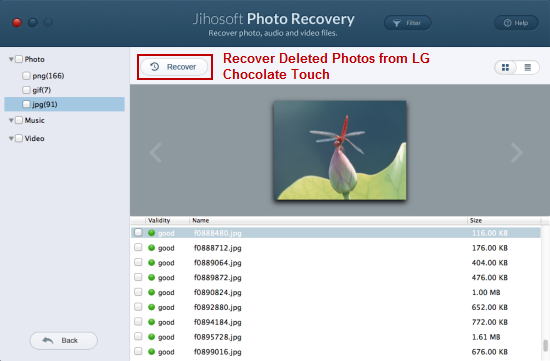 My friend recommended Jihosoft Photo Recovery for Mac. This LG Chocolate Photo Recovery software is designed to do photo recovery from LG Chocolate Android phone. By using it, you can restore deleted pictures, videos, and songs from LG VX8575 with ease. Other than LG Chocolate, it recovers photos from various models of mobile phones like LG Optimus, LG Dare, LG Ally, LG Rumor Touch, etc. Moreover, it supports other brands of Android smartphones like Samsung, HTC, Motorola, Sony, and more. For Windows user, please select Jihosoft File Recovery.