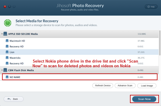 Start Nokia Photo Recovery Mac. Click on “Recover Photo”, select the drive letter of Nokia mobile phone, and then click the “Start Scan” button. The software will immediately start to scan deleted photos and videos on your Nokia cell phone.
