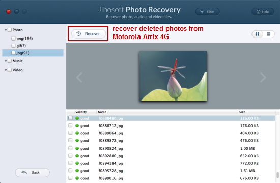 This Mac Motorola Atrix Photo Recovery is a professional application that helps in the recovery of deleted photos with perfection. Not only images, but also video and music files can be retrieved. Most file types are supported like JPG, PNG, BMP, GIF, MP4, AVI, MOV, FLV, MP3, WAV, etc. Besides, if you need to perform photo recovery on Windows, you can try Jihosoft File Recovery.
