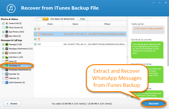 Restoring from iTunes backup would wipe your current data with those in the backup. What if you have added new data to your iPhone, or worse, your iPhone is damaged or lost. In such case, to get back you deleted WhatsApp messages, we recommend Jihosoft Free iTunes Backup Extractor. It is an ultimate free iPhone data recovery utility to help you extract and retrieve WhatsApp messages from iPhone backup. Here are the steps you need to take:
