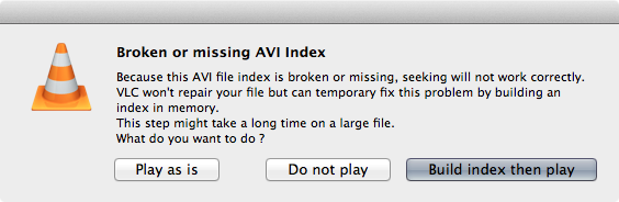 VLC offers an easy way to repair broken AVI file. When you try to play a broken AVI file with VLC, there will be a dialog box appears. Just the select the repair option to fix broken AVI file.