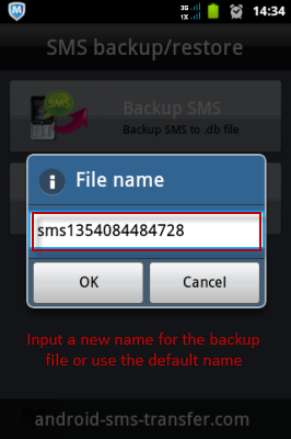 The File name dialog box will pop-up. You can input a new name for the backup file or just use the default name. After that, click “OK”, all your Android text messages will be automatically saved to micro-SD card in .db file.