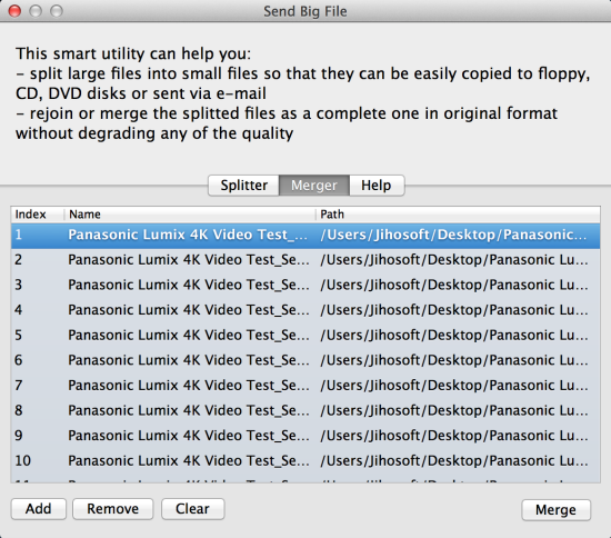 1. Go into the “Merger” tab. Click “Add” to import all the split files he received.