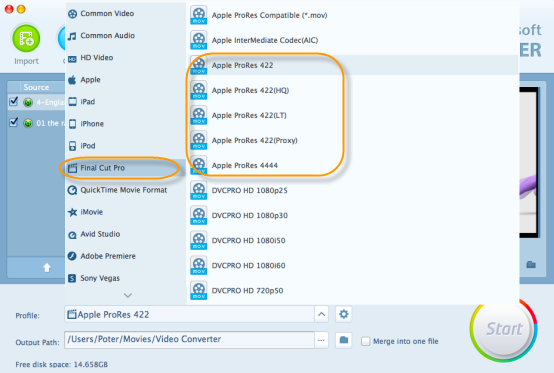 Step2: select “Final Cut Pro” -> “Apple ProRes 422” as the output profile