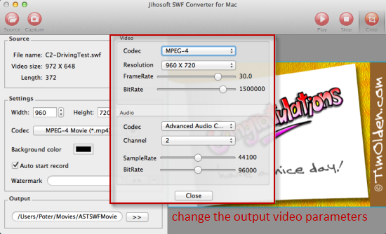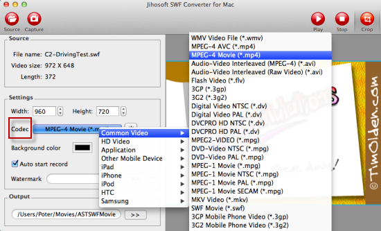 SWF Converter for Mac supports many output profiles, select MP4 or MOV etc as the output format from the drop-down list of “Codec”.