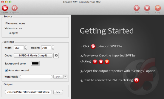Click the “Source” button to load flash SWF file to the program. You can click on the “Play” button to preview the imported SWF video.