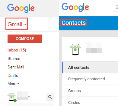 4. Sign in your Gmail account on computer> hit the drop-down list of “Gmail”> select “Contacts” to view your backup as a vCard file.